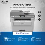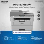 The Brother MFC-B7715DW is an all-in-one monochrome laser printer designed for efficient document handling. Features include high-speed printing, auto duplex, ADF, and versatile connectivity for seamless workflow.