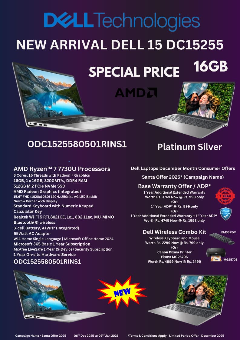 The Dell 15 Thin & Light Laptop is built for high performance, smooth multitasking, and everyday productivity. Powered by the AMD Ryzen™ 7 7730U processor, it delivers fast response and efficient performance for office work, business use, study, and entertainment.