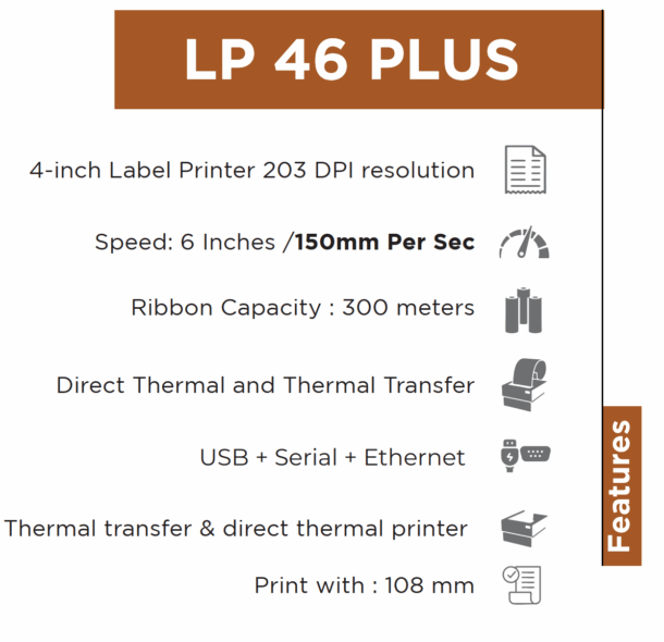 The TVS LP 46 Plus is a label printer designed for efficient, high-quality label printing. Ideal for businesses that require customized labels for products, shipping, and inventory management, this printer delivers fast and precise results. It supports various label sizes and types, making it versatile for a range of applications. With its high-resolution printing capabilities, easy-to-use interface, and durable design, the TVS LP 46 Plus is an excellent solution for small to medium-scale labeling tasks.