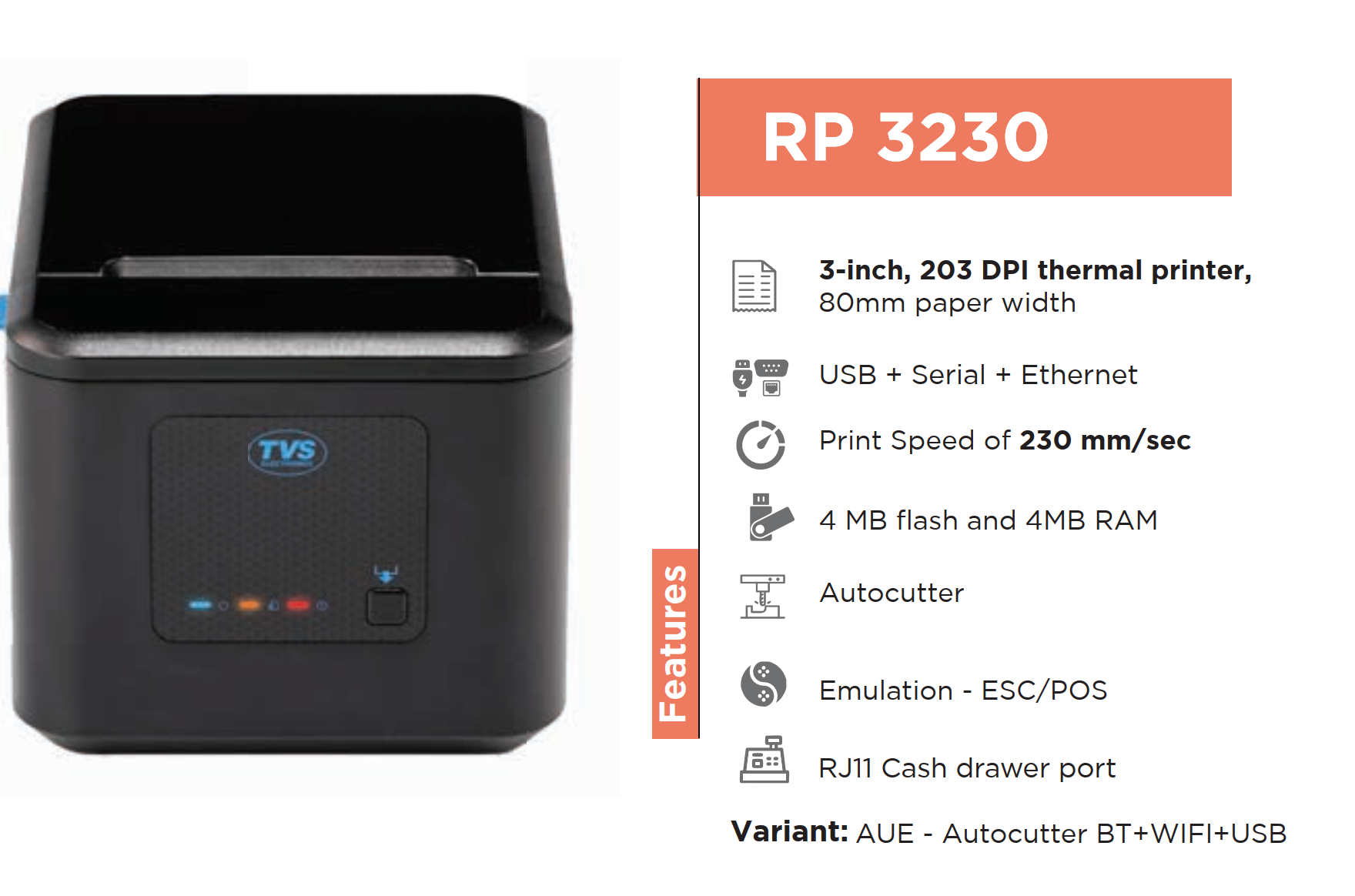 The TVS RP 3230 is a high-performance 3-inch thermal receipt printer designed for quick, reliable printing in retail and business environments. With fast print speeds and durable build quality, it ensures seamless transaction processes, offering crisp, clear text and graphics. Ideal for busy environments, it features easy integration with various systems and low maintenance costs. Perfect for businesses looking for efficiency and reliability in point-of-sale printing.